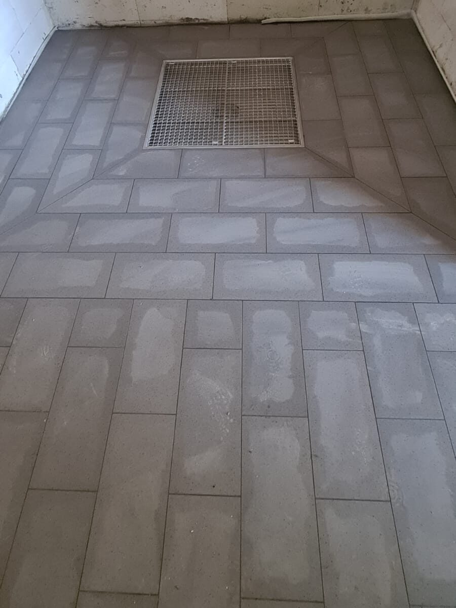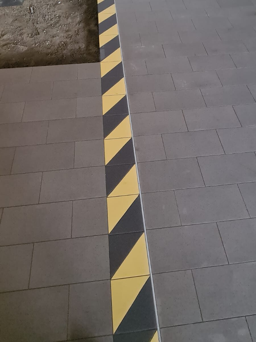 Stanowisko maszyny czyszczącej wykończyliśmy kratą o wymiarach 800×800 firmy ATT, jest to produkt dedykowany dla tego typu sklepów. Rampa w pomieszczeniu dostaw, wykończyliśmy metalowymi płytkami Stelcom, tak aby przenosić naprężenia i zapobiegać pękaniom posadzki. Wykonaliśmy żółto czarny pas z płytek magazynie i przy mroźni. Oczywiście nieodzownym elementem układania płytek metodą wibracyjną jest rozłożenie odpowiedniej siatki dylatacyjnej – przeciwskurczowej, która zapobiega ewentualnym skurczą lub rozkurczą posadzki.
